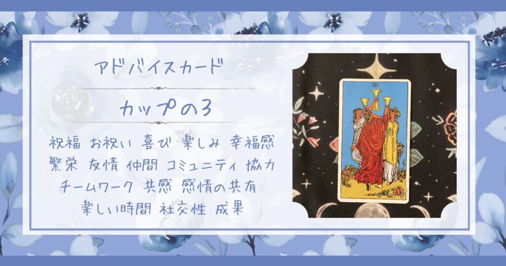 また、カップの3は「お祝い」や「祝福」も象徴しています。