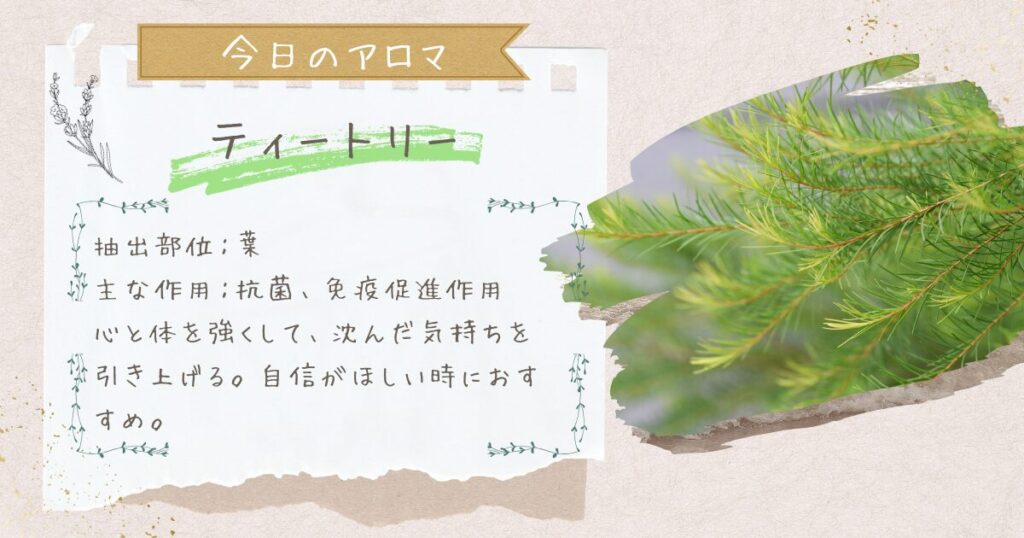 ティートリーのクリアな香りが、余分な不安や迷いを軽くしてくれるかもしれません。